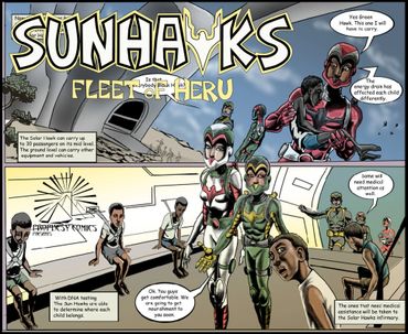 New Kemet, is the front line of defense against the invaders from the people of the Ice, Sand and other hostile tribes. Colonizers that would rob the Suntribe of it's natural resources. To combat these invaders are the highly trained and uniquely talented Sunhawks. Comprised mainly of orphans from the big war, that were raised and trained at the Heru Academy, an institution started by elders of New Kemet, to produce great engineers, scientists and defenders of the planet. Nefertiti, is the brave leader. Rameses is the wise and knowledgable second in command. Khufu, is the spiritual center of the squad. Pepi, is the scientific genius, who can solve almost any equation. Djoser, is the muscle mechanic who pilots the great Solar Hawk space vessel used by the Sun Hawks. Take a journey with the Sunhawks on their adventures exploring the planet in our solar system.